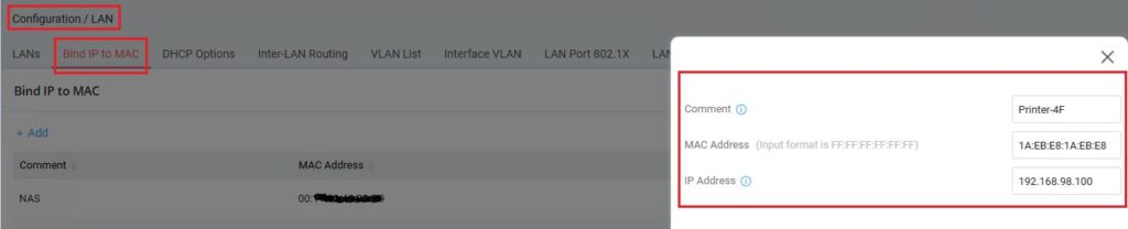 Para modelos baseados em DrayOS 5, aceder ao menu “Configuration / LAN / Bind IP to MAC”, clicar em “+ Add” para adicionar o respectivo endereço MAC e endereço IP, e depois carregar em “Apply”: