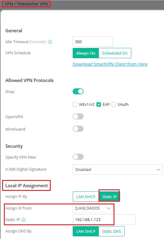Aceda ao menu “VPN and Remote Access >> Remote Dial-in User” (ou “VPN /Teleworker VPN”) e no respectivo perfil de utilizador remoto VPN, seleccione a respectiva rede (Subnet) e active a opção “Assign Static IP Address” (ou “Static IP”) e introduza o Endereço IP Estático para este utilizador remoto VPN: