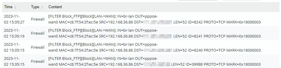 Neste caso podemos ver que o router bloqueou as tentativas de ligação (da LAN para WAN) à porta 21 (TCP).