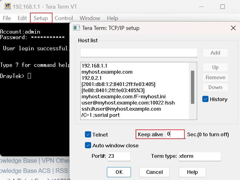 4. Introduza o nome de utilizador e a password de início de sessão do router para criar a ligação Telnet. Aceda ao menu “Setup >> TCP/IP” e altere a configuração de Keep alive de 300 segundos para 0 segundos. Esta alteração permite manter a ligação telnet estável; caso contrário, o TeraTerm poderá encerrar a ligação após 300 segundos.