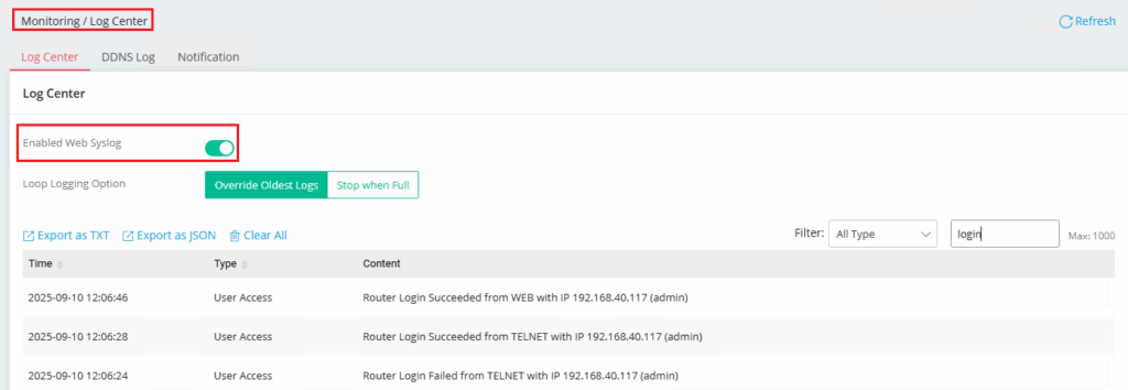 Aceder ao menu “Diagnostics >> Syslog Explorer” (ou “Monitoring / Log Center”), activar a opção “Enable Web Syslog” e escolher “Syslog Type” (ou “Filter”), o router começará a apresentar os respectivos dados. Para guardar estes dados num ficheiro, clicar em “Export”. Será criado um ficheiro chamado web_syslogxxxxxxxx (onde xxxxxxxx é a data actual) que será descarregado para o seu computador.