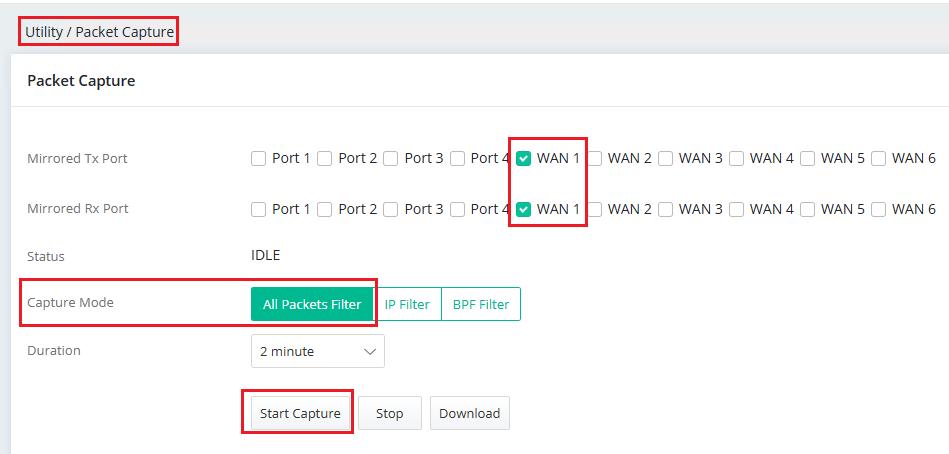 1 – Aceda ao menu “Utility / Packet Capture”:
