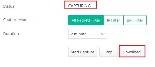 • Uma vez terminada a Captura, mostrará no Status como “Idle”, depois clique em “Download” para descarregar o ficheiro .pcap: