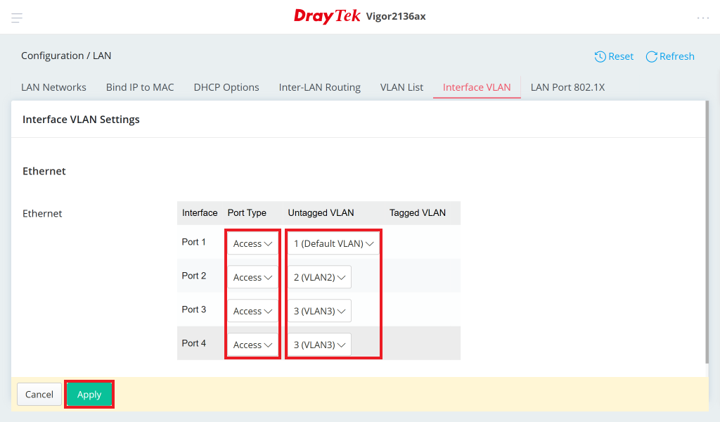 - Para a Porta 3, seleccione “Access” como tipo de porta (“Port Type”) e defina “3 (VLAN3)” como “Untagged VLAN”.