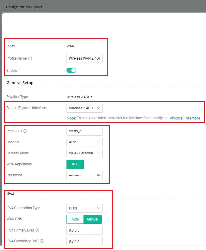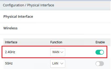 Para modelos baseados em DrayOS 5, aceder ao menu “Configuration / Physical Interface” e seleccionar e activar a Interface Wireless 2.4GHz como “WAN”: