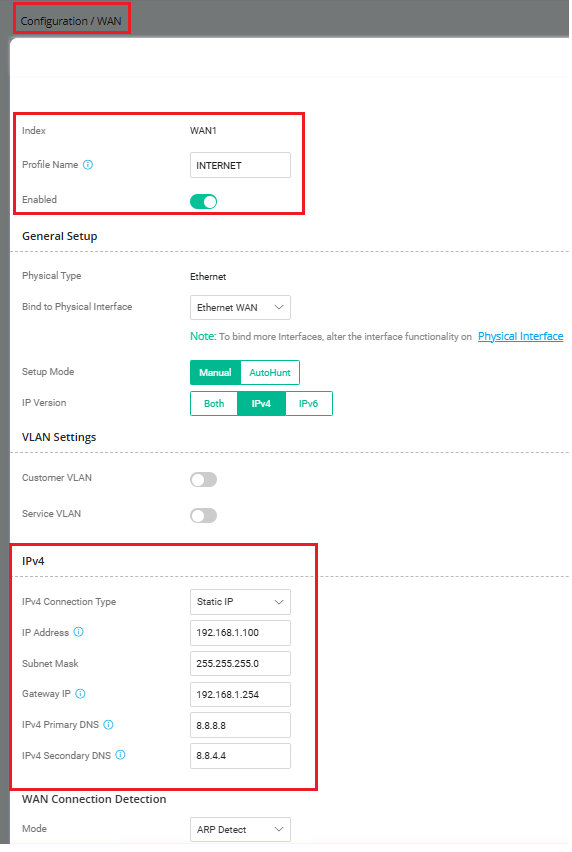 1 – Configurar em “WAN >> Internet Access > WAN1 > Static or Dynamic IP” (ou “Configuration / WAN”) com os respectivos IP’s :