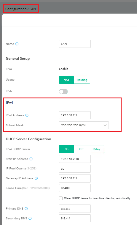 De origem os Routers DrayTek usam como rede de LAN o endereço 192.168.1.1, pelo que terá de alterar esta rede para outra (p.ex: 192.168.2.1), pode fazer esta alteração no menu “LAN >> General Setup” (ou “Configuration / LAN”):