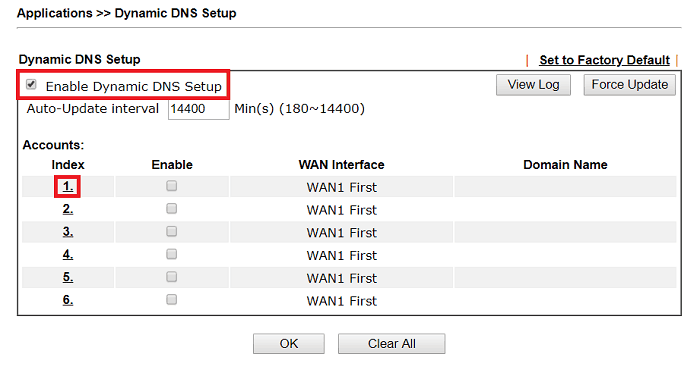 1 – Após criar uma conta e registar um nome de host (domínio) (ex: routerxpto.ddns.net) no respectivo fornecedor externo de DDNS (ex: No-IP), aceda ao menu do router “Applications >> Dynamic DNS Setup” (ou “Configuration / WAN / Dynamic DNS” + ” Add”), active a configuração de DNS dinâmico e clique num número de índice disponível: