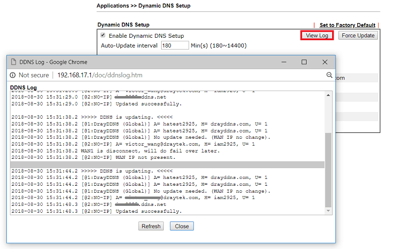 3 – Após clicar em OK (ou “Apply”), o router tentará actualizar o seu endereço de WAN IP para o servidor DNS dinâmico escolhido, actualizado o respectivo nome de host (domínio). Pode clicar em “View Log” neste mesmo menu (ou em “Monitoring / Log Center / DDNS Log”) para verificar se a actualização foi bem-sucedida.