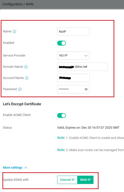 f. Use “WAN IP” em “Determine WAN IP” (ou “Update DDNS with”) para usar o IP real da WAN se a WAN do router estiver ligada directamente à Internet (com endereço IP Público). Se o router estiver atrás de NAT (duplo-NAT), seleccione “Internet IP”.
