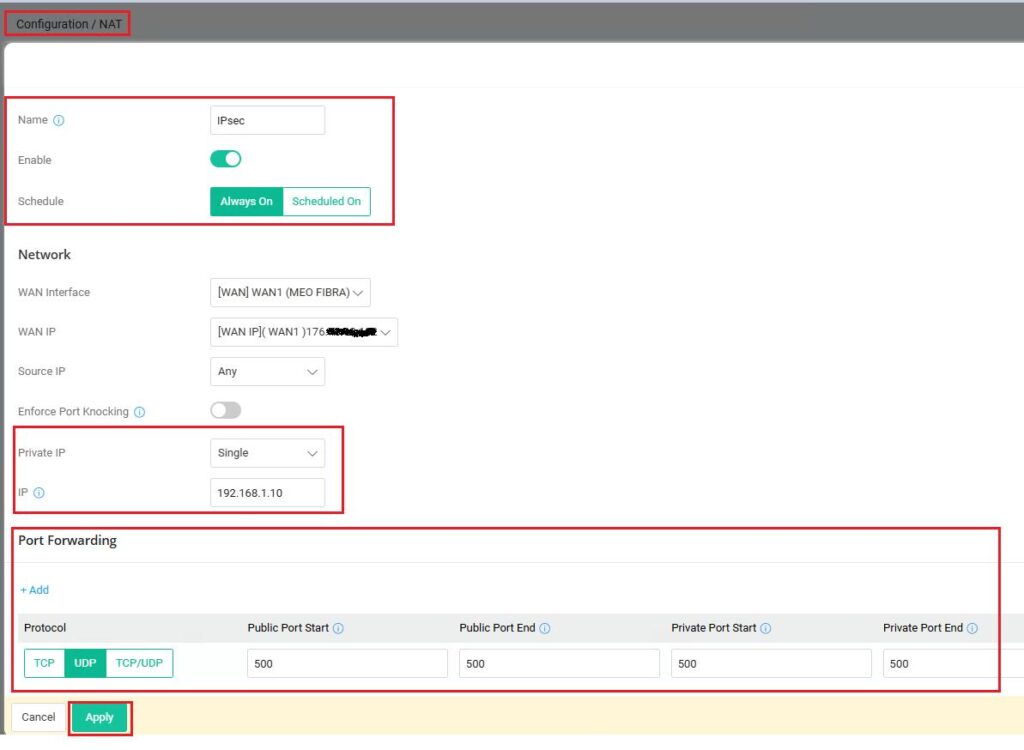 2 – Aceder ao menu “NAT >> Open Ports” (ou “Configuration / NAT”) e abrir as portas necessária para o endereço IP do servidor VPN que se encontra na LAN do router DrayTek: