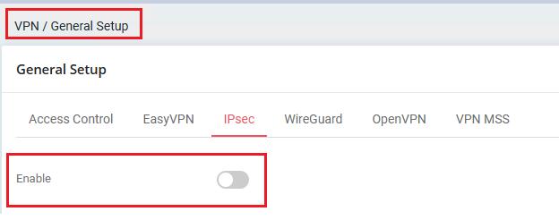 1 – Desactive o respectivo serviço VPN no router: Aceda ao menu “VPN and Remote Access >> Remote Access Control Setup” (ou em “VPN / General Setup”) e desmarque o protocolo VPN que pretende encaminhar para a LAN do router, vamos usar o protocolo VPN IPsec como exemplo: