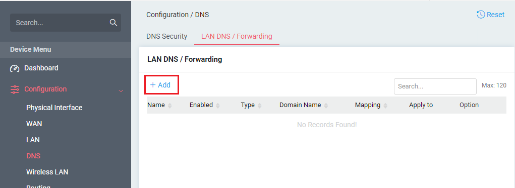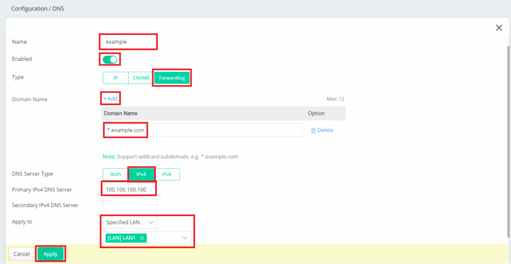 Para modelos baseados em DrayOS 5, aceder ao menu “Configuration / DNS / LAN DNS / Forwarding”, clicar em “+ Add” para adicionar uma regra de LAN DNS Forwarding conforme exemplo e depois carregar em “Apply”:
