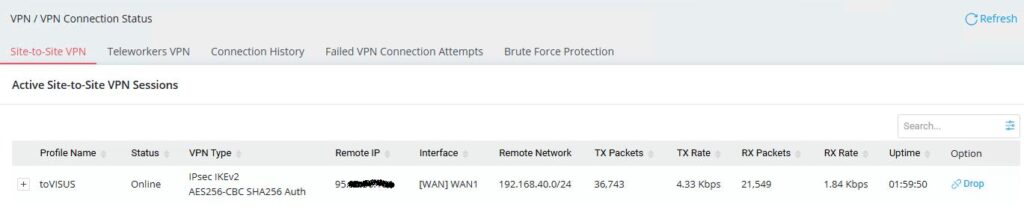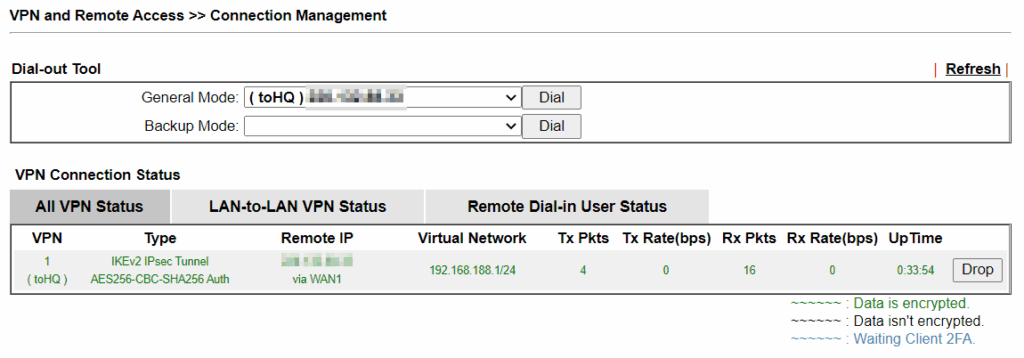 Após terminar as configurações acima, o Router B (VPN Client) deverá estabelecer automáticamente o túnel VPN IPsec LAN-LAN para o Router A (VPN Server). Podemos verificar o estado da VPN no menu “VPN and Remote Access >> Connection Management” (ou em “VPN / VPN Connection Status / Site-to-Site VPN”):