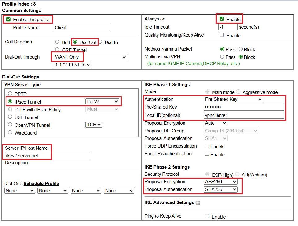 - Seleccionar IPsec IKEv2 nas definições de Dial-Out