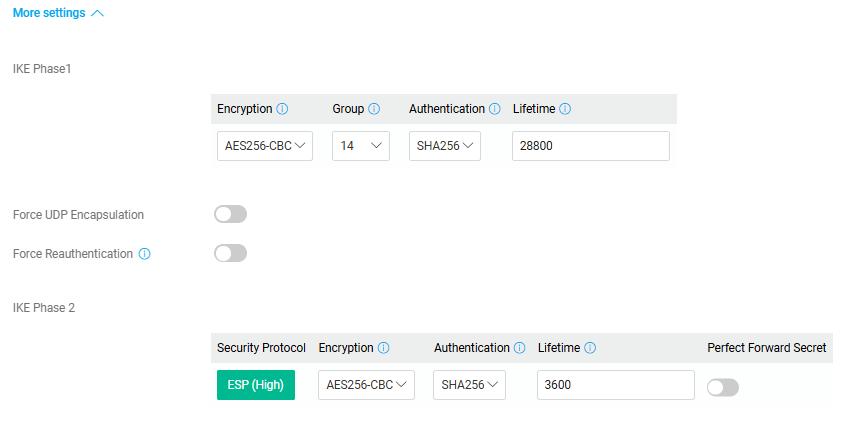- Selecione AES256/G14/SHA256 como o algoritmo de encriptação de IKE para as propostas da Fase 1 e da Fase 2.