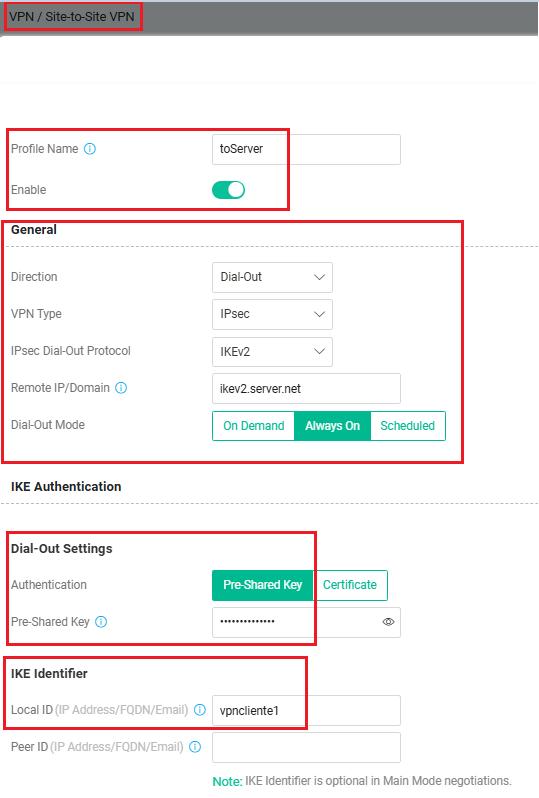 - Colocar o ID definido no Rouer A (VPN Server) em Local ID (ex: vpncliente1)