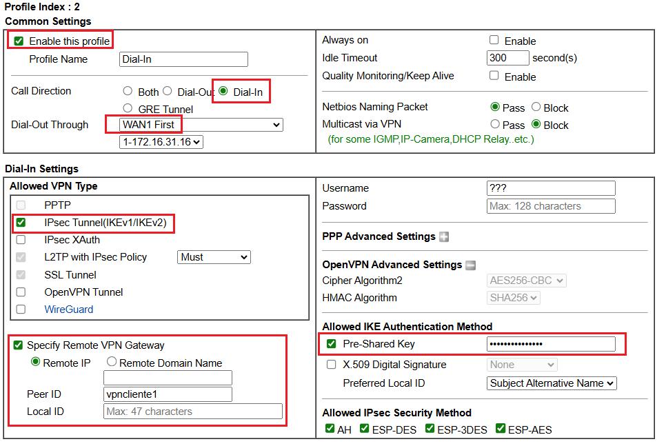 - Seleccionar IPsec Tunnel (IKEv1/IKEv2) nas definições de Dial-In