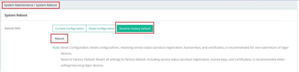 Entrar na interface web do seu router, e navegar para System Maintenance > Reboot System (ou “System Maintenance / System Reboot”). Nesta página, escolha “Using factory default configuration” (ou “Reset to Factory Default”) e clique em Reboot Now. Após a reinicialização do router, este será restaurado com as configurações padrão de fábrica.