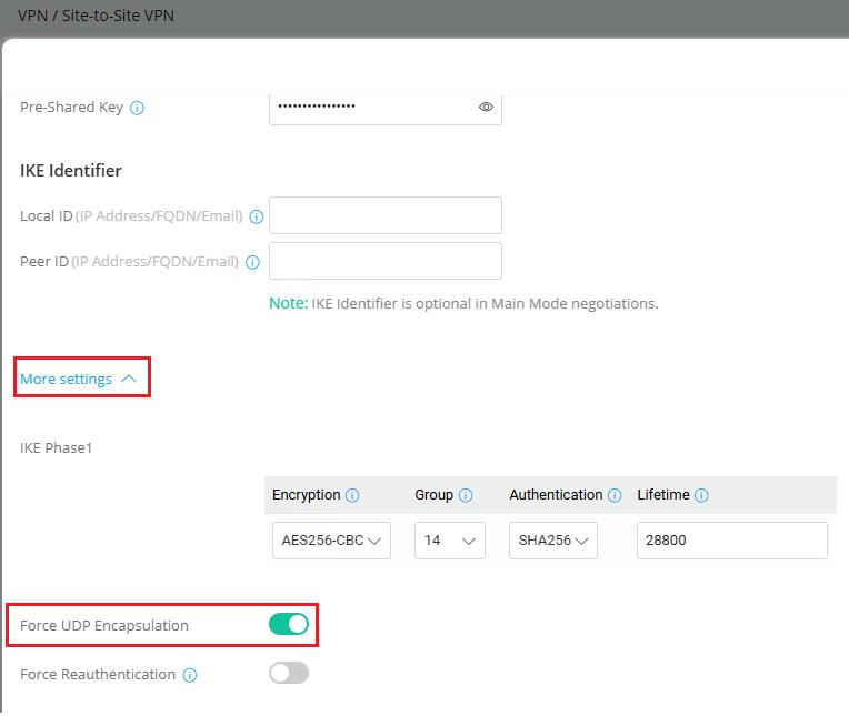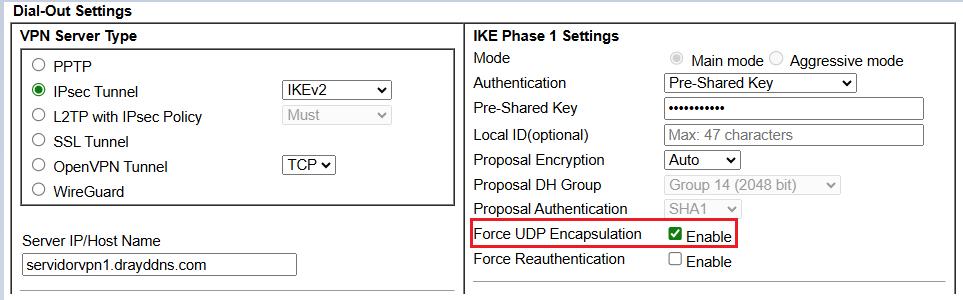 Aceda ao menu “VPN and Remote Access >> LAN to LAN” (ou “VPN / Site-to-Site VPN“) e no respectivo perfil de VPN (dial-out) active a opção “Force UDP Encapsulation“: