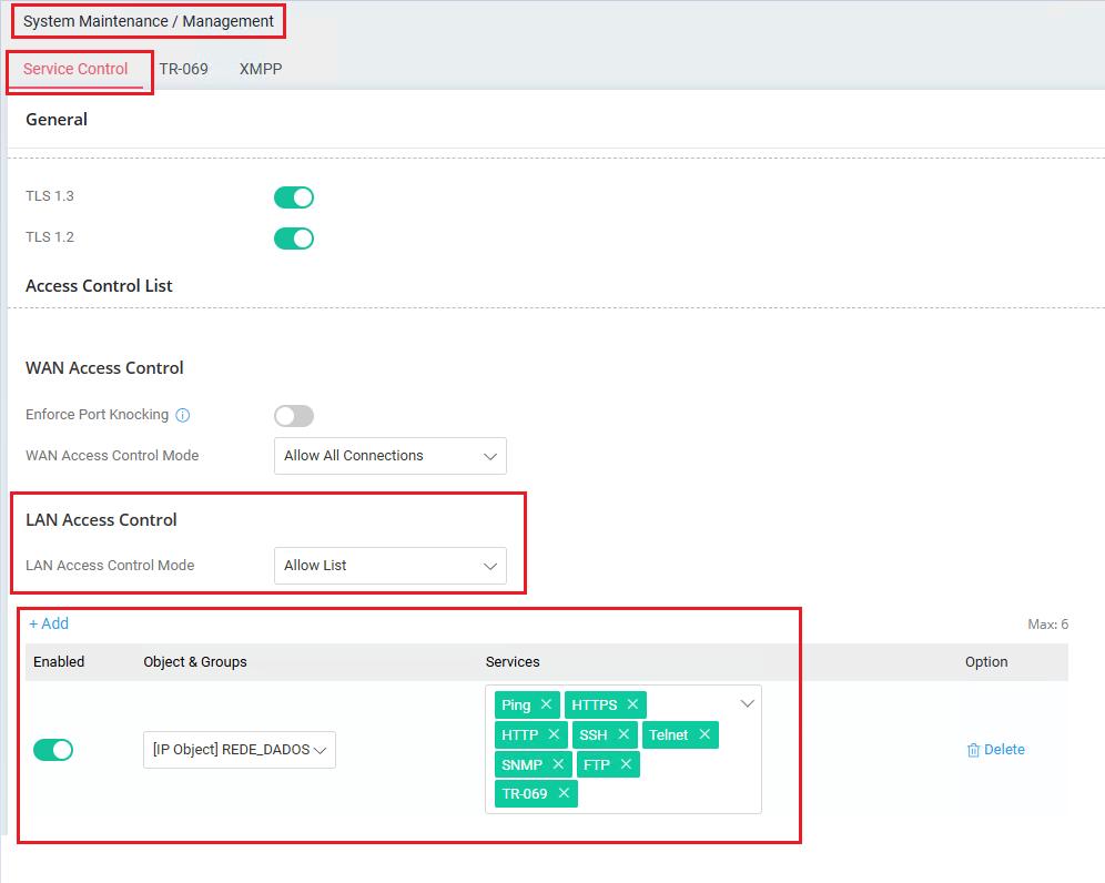 Para modelos baseados em DrayOS 5, aceder ao menu “System Maintenance / Management / Service Control”, escolher o modo “LAN Access Control” como “Allow List”, clicar em “+ Add” para adicionar as respectivas redes/IPs (por “IP Object” ou “IP Group”), escolher os Serviços pretendidos (em “Services”) conforme exemplo e depois carregar em “Apply”: