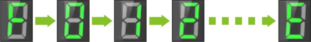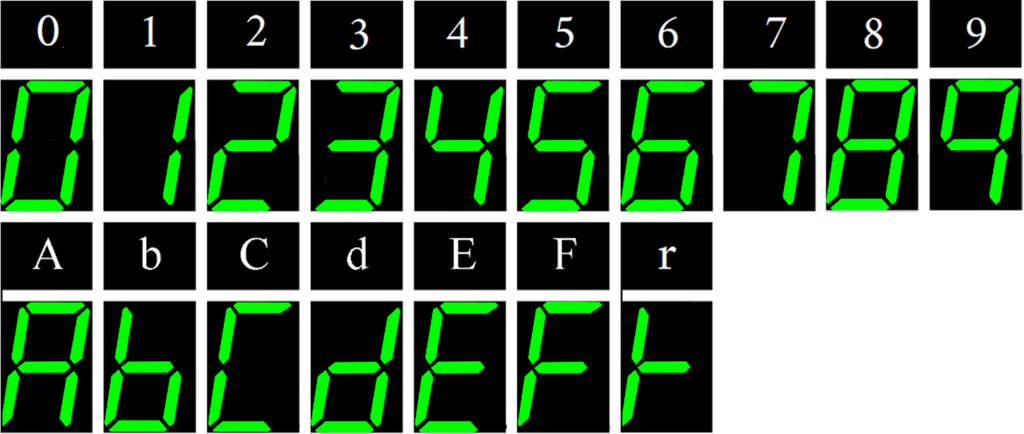 Aqui está um exemplo de números e letras de A a F e r no Visor de 7 Segmentos para referência: