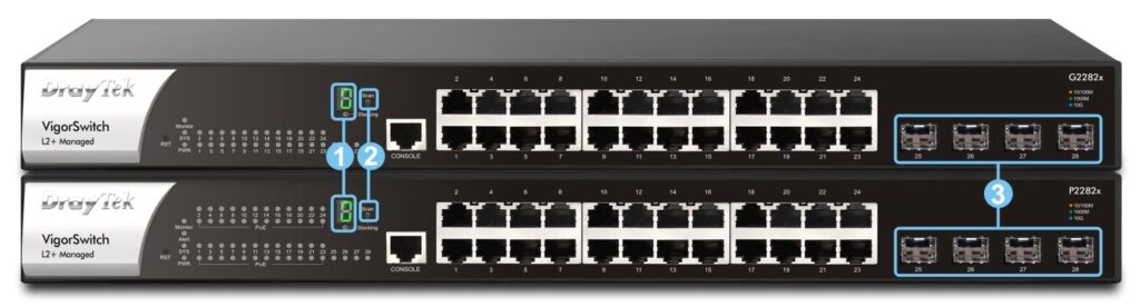 O VigorSwitch usa as portas 10G SFP+ como portas de Stacking para ligar as Unidades, exigindo um link 10G para funcionar. Os modelos G e P podem estabelecer Stacking e exibir o PD para as portas no modelo P.