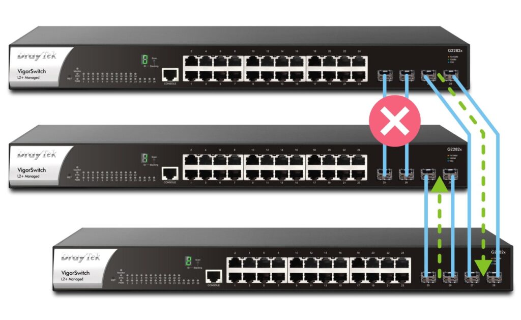 O Stacking é um método de ligar várias unidades de switches (da mesma série) para que possam funcionar como um único switch lógico. Com o Stacking activado, é possível agrupar até 4 unidades de VigorSwitch (que suportem Stacking), permitindo gestão centralizada através de um único endereço IP. Isso não só simplifica a configuração e monitorização da rede, como também melhora a escalabilidade e a flexibilidade. Os administradores de rede podem expandir a capacidade adicionando switches ao stack sem interromper a configuração existente. Além disso, o Stacking permite redundância aprimorada — se a unidade mestre (Principal) falhar, outro switch do stack pode assumir automaticamente para manter a continuidade da rede.