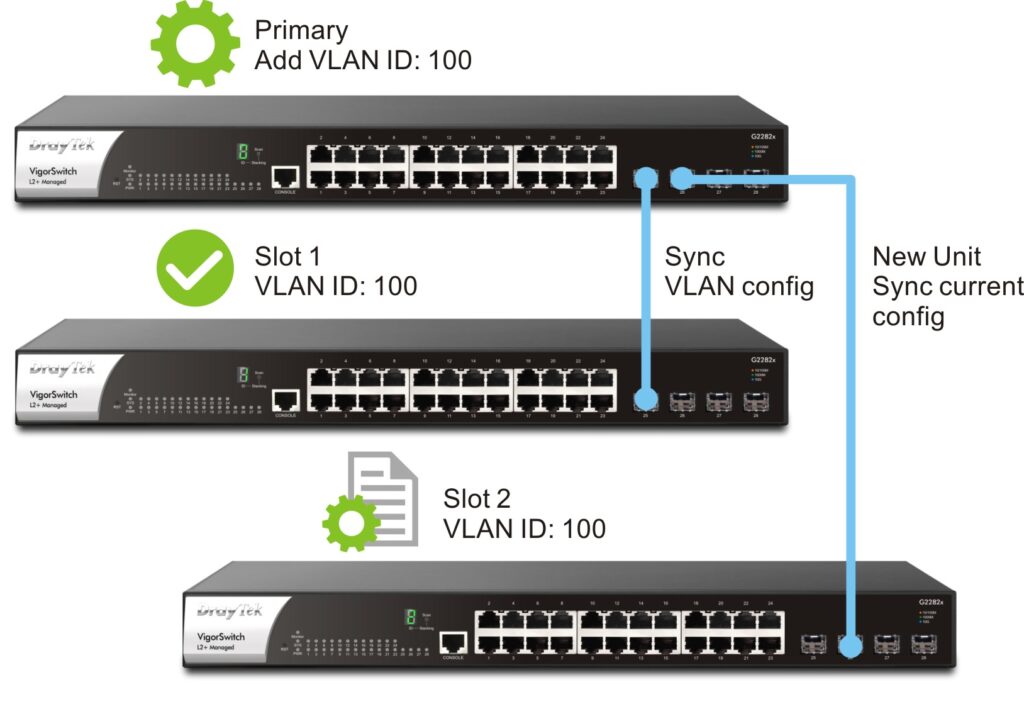- Ao configurar, por exemplo, o ID de VLAN 100 no primário, a configuração da VLAN 100 também será sincronizada com todas as unidades de slot.