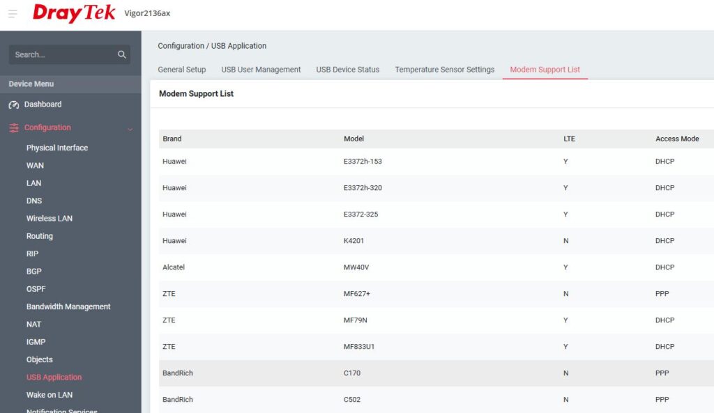 Pode encontrar a lista de modems USB 3G/4G/LTE compatíveis com os routers DrayTek na página de gestão do próprio router no menu “USB Application > Modem Support List” (ou “Configuration / USB Application / Modem Support List”):